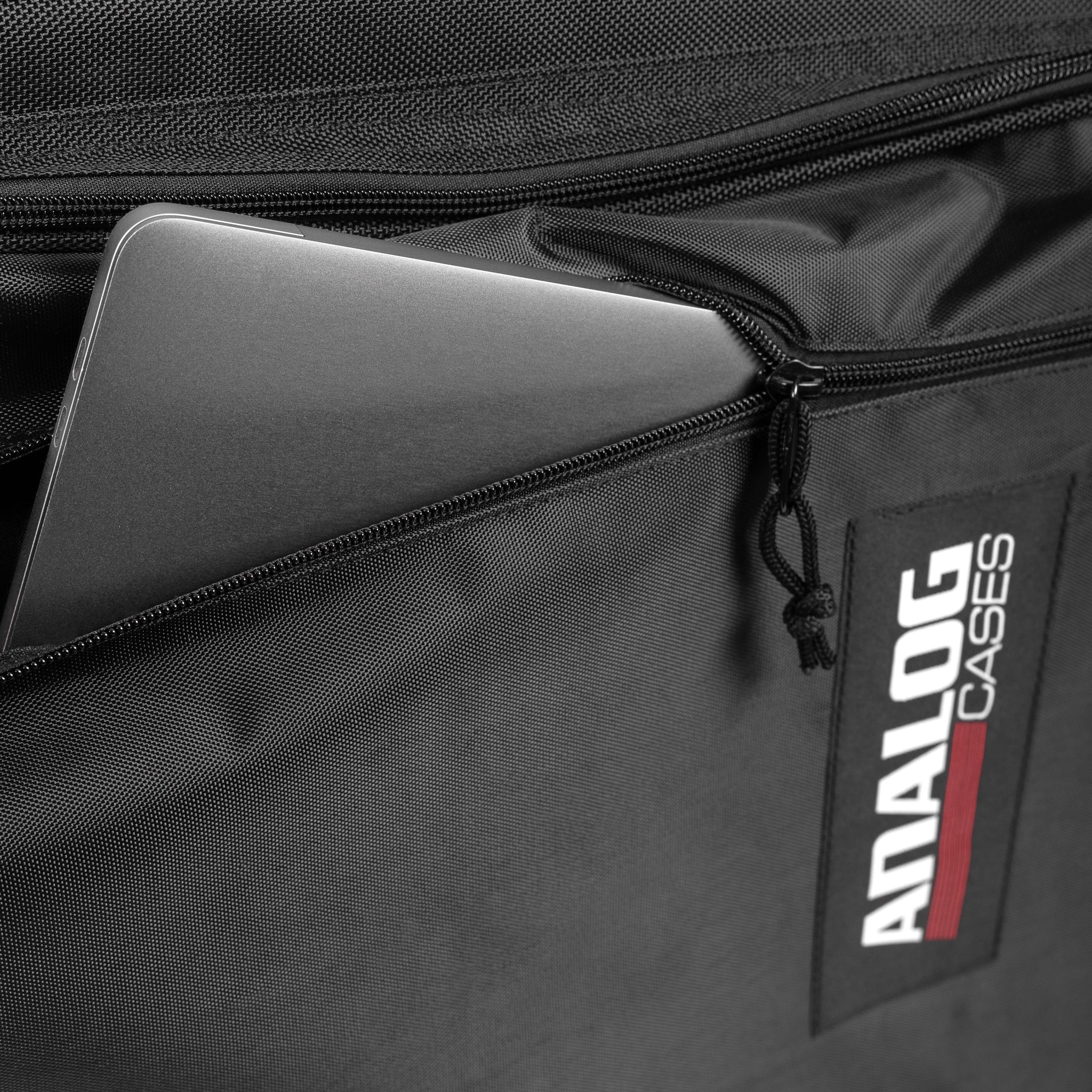 - ケーブル、ノートPC、その他機材を収納できる大型ポケット付き