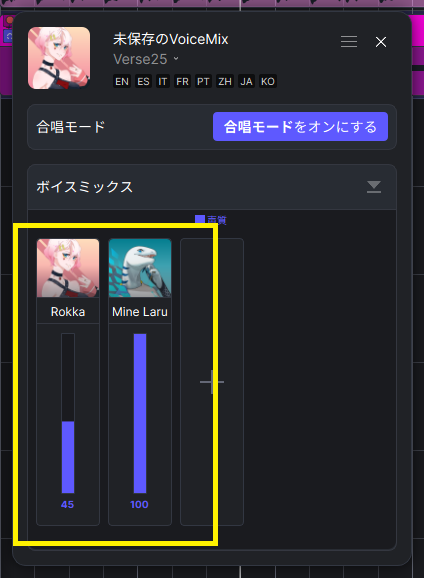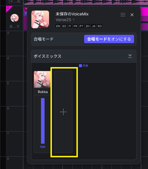 ボーカルミックスで追加できるキャラクター数は、正確な数は不明ながら、現状無制限に設定できるようです。しかしながらミックスするキャラクターが増えるほど、声質の調整が煩雑になり、意図する効果が得られ辛いように感じられました。