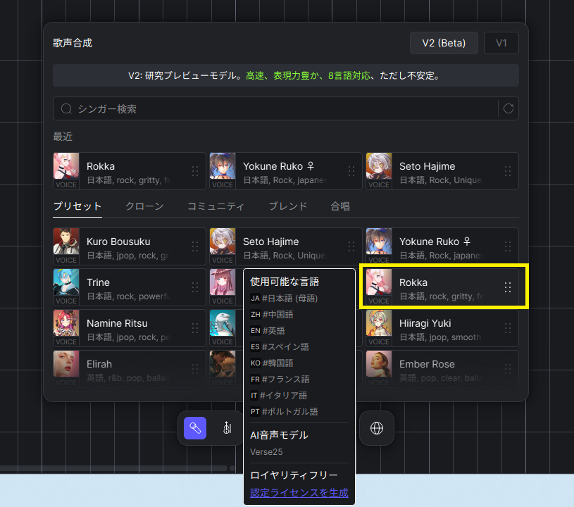 ボーカルキャラクターを選ぶ際には各キャラクター上でマウスオーバーすると、使用可能な言語などがポップアップ表示されますので、歌詞に合わせてキャラクターを選ぶ際の参考にすることができます。