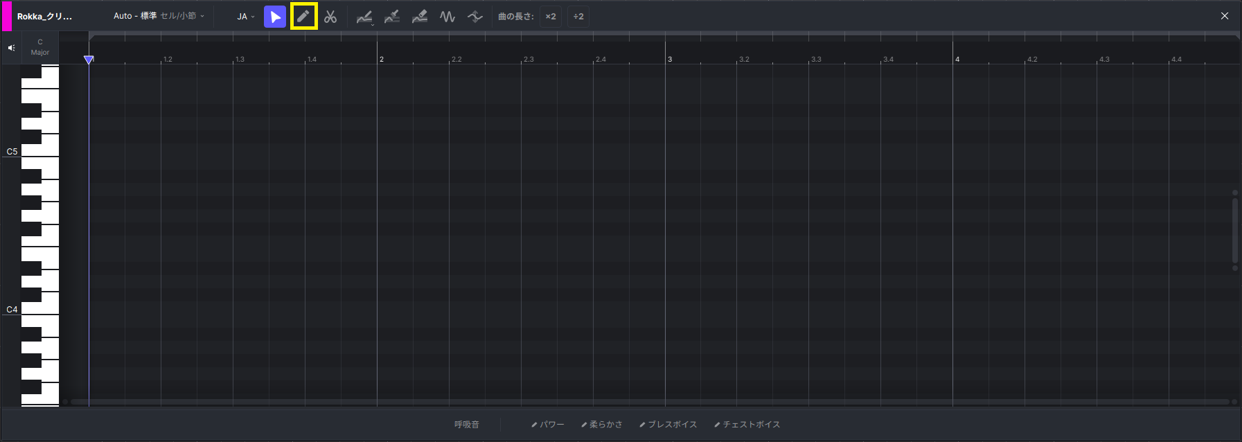エディタ上部に配置されているペンシルツールでメロディーのフレーズを入力します。