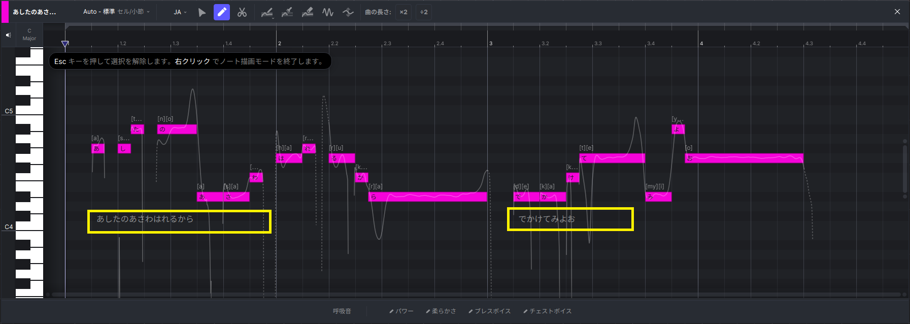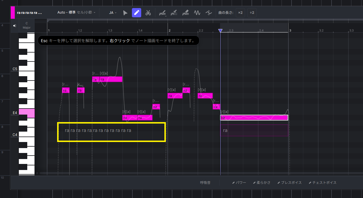 入力したMIDIノートに一文字ずつ入力することももちろん可能ですが、図5の黄色の枠線で囲んだ部分にフレーズの区切り目までをまとめて入力することもできます。