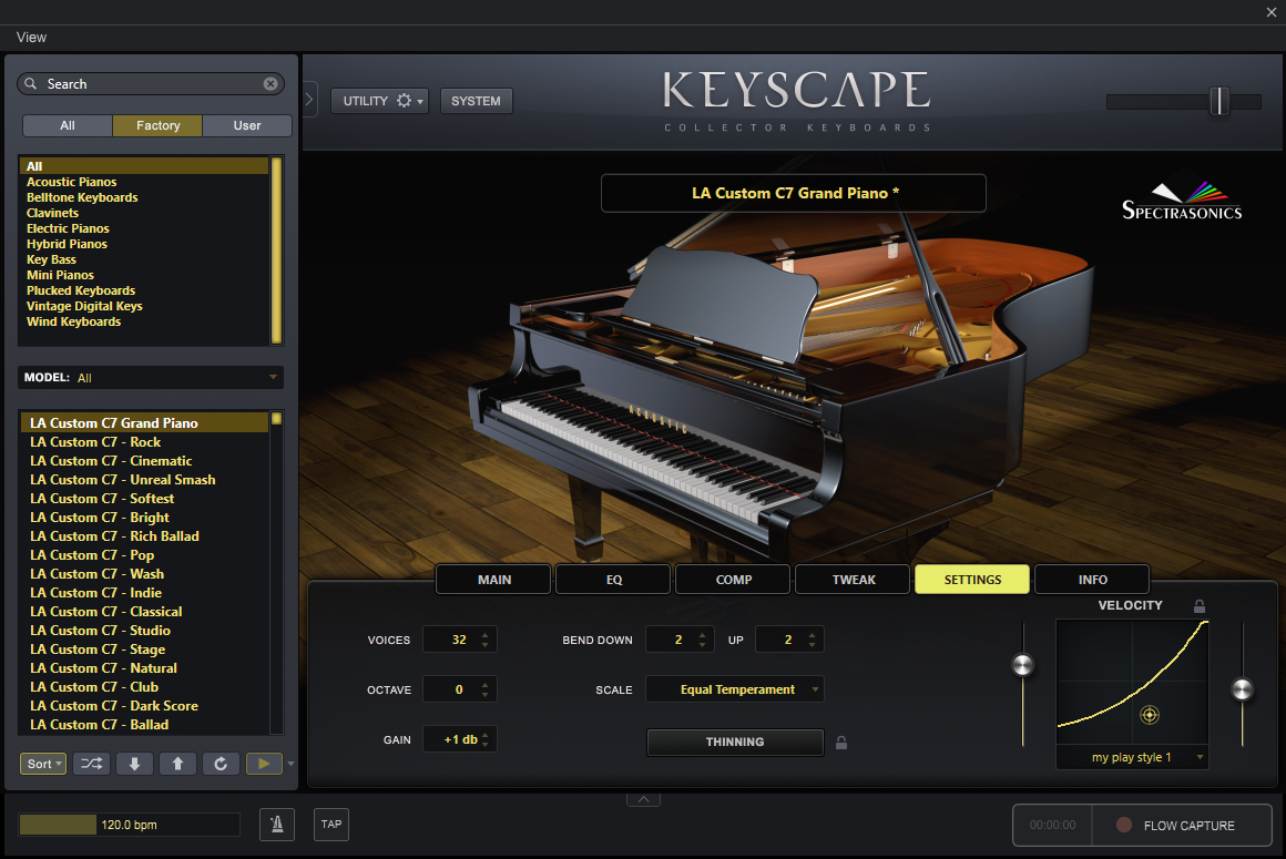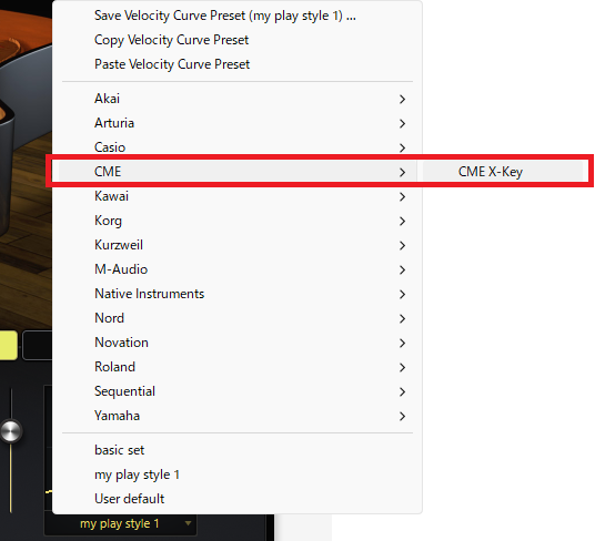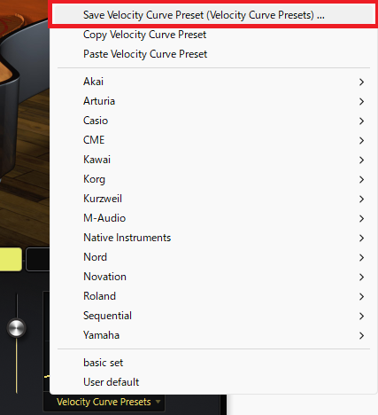 なお、KeyScapeにはいくつかのキーボードに最適化されたベロシティカーブのプリセットも用意されています。