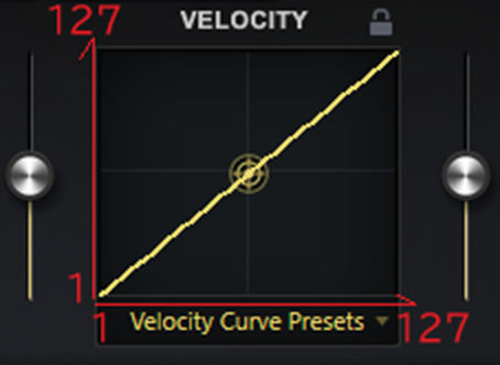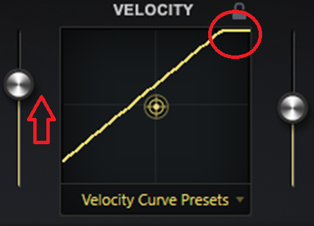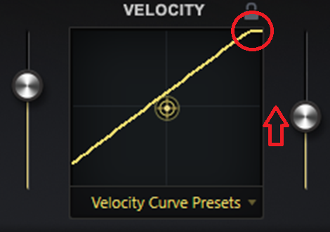 そこで、設定を行う場合には、デフォルトのベロシティカーブの状態から最初に一番弱く弾いた状態でどれ位の大きさにしたいかを左側のスライダーを上方向に動かし、演奏時の一番弱く弾いた状態で意図する音の大きさの位置を決めます。この時に最大値の発音するベロシティ値も127から小さい値の方向にシフトしてきます。