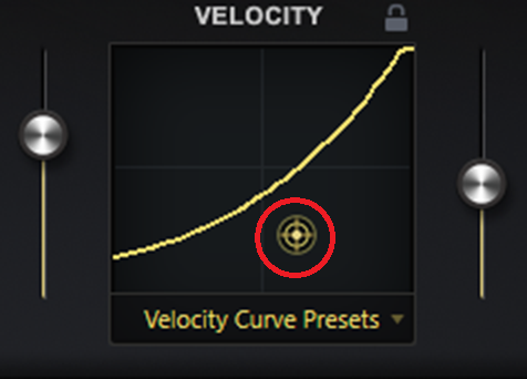 この時のポイントは最小と最大値の間となる中間値のレスポンスが自然な感じで演奏できているかどうかをチェックし、それを踏まえて画面上の中央に配置されている点が二重環で囲まれている部分(コントロールポイント)をマウスでドラッグしつつ、カーブの形を調整します。