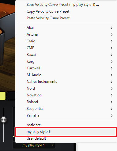 図7:プリセットリスト上にベロシティカーブ名が表示され、ユーザープリセットとして登録できたことが確認できる。