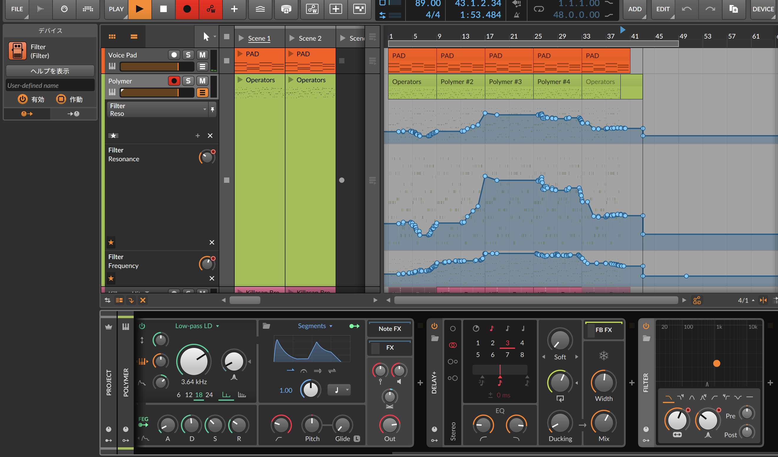 ドラムのトラックにキックだけのパターンを準備してみました。もっと展開を作りたいので、PolymerにFilterのデバイスを追加してオートメーションを録音します。