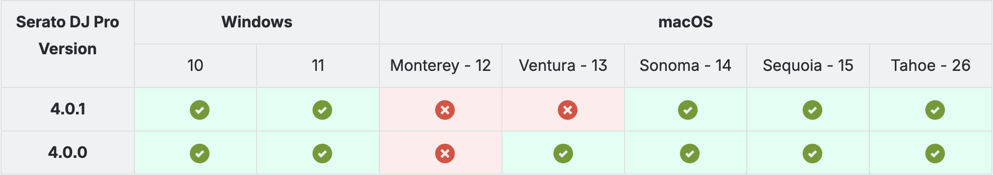 Serato DJ Pro | OS互換表(v.4.0以降)