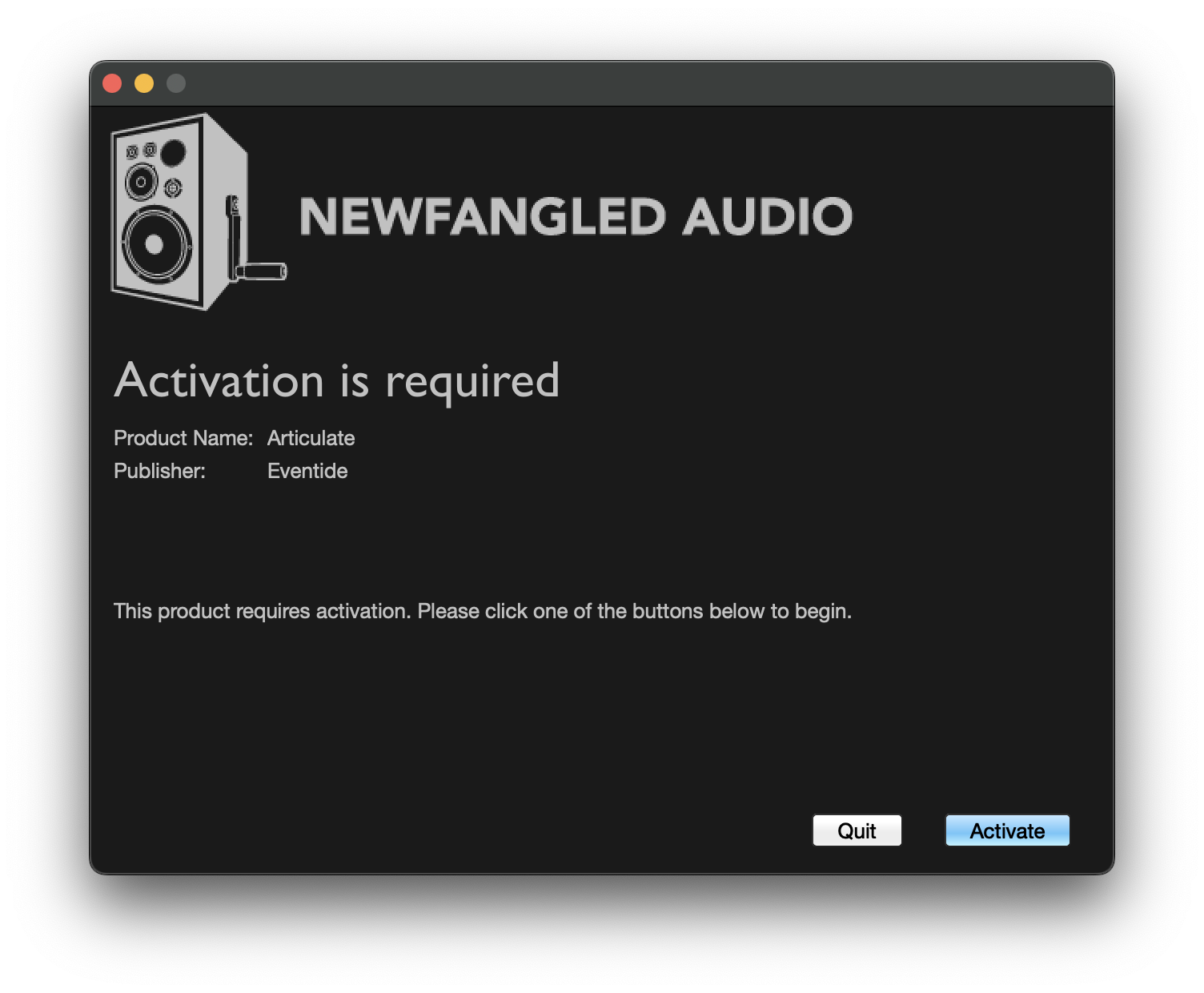 1. DAW等のホストアプリケーション上で、インストール後のEventide製品を読み込むと、アクティベートを求める画面が表示されます。Activateをクリックします。