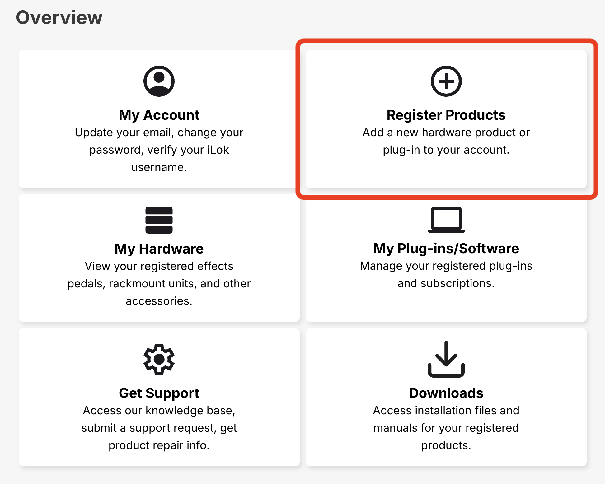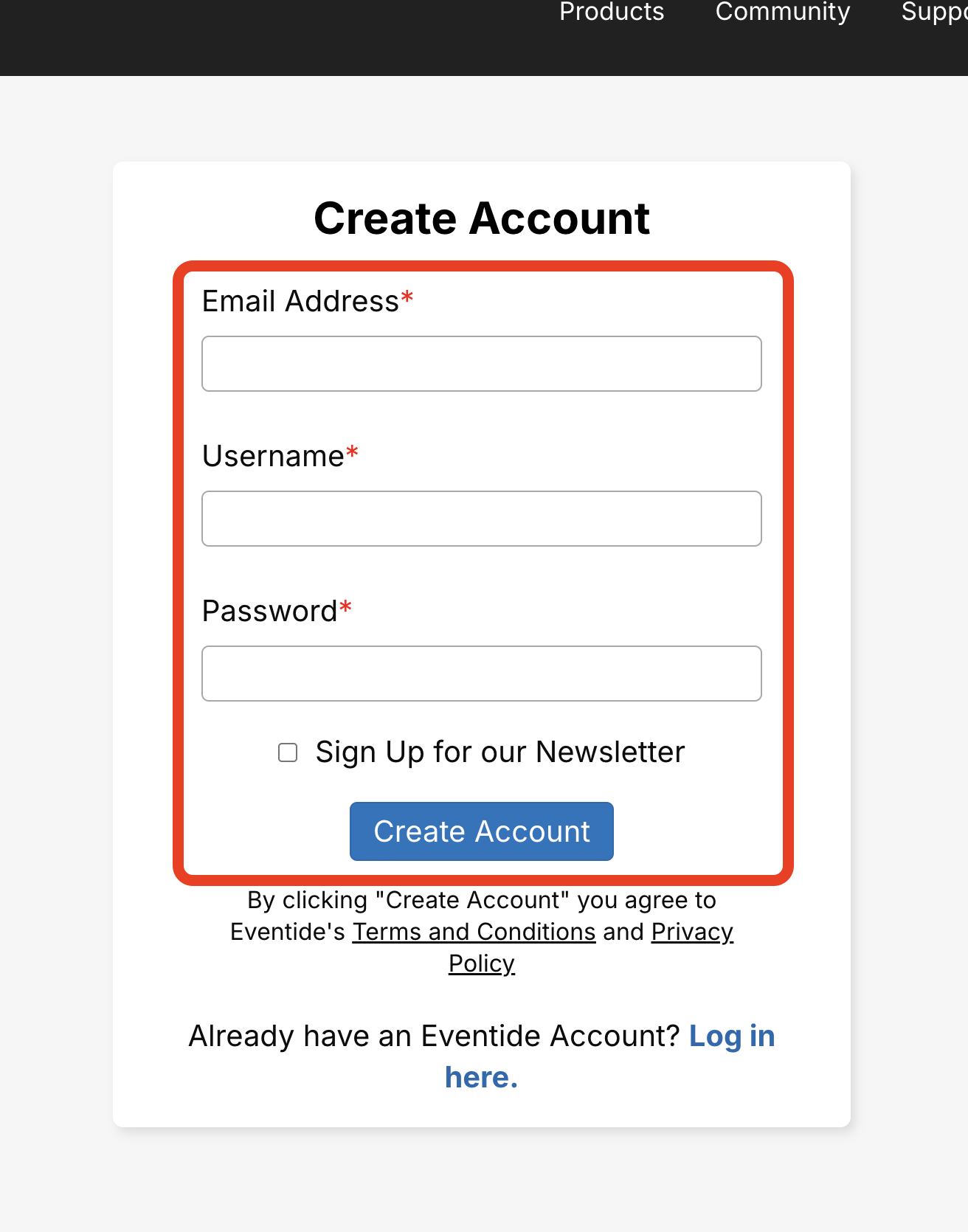 1. Eventideのアカウントページにアクセス・ログインし、Register Productsをクリックします。