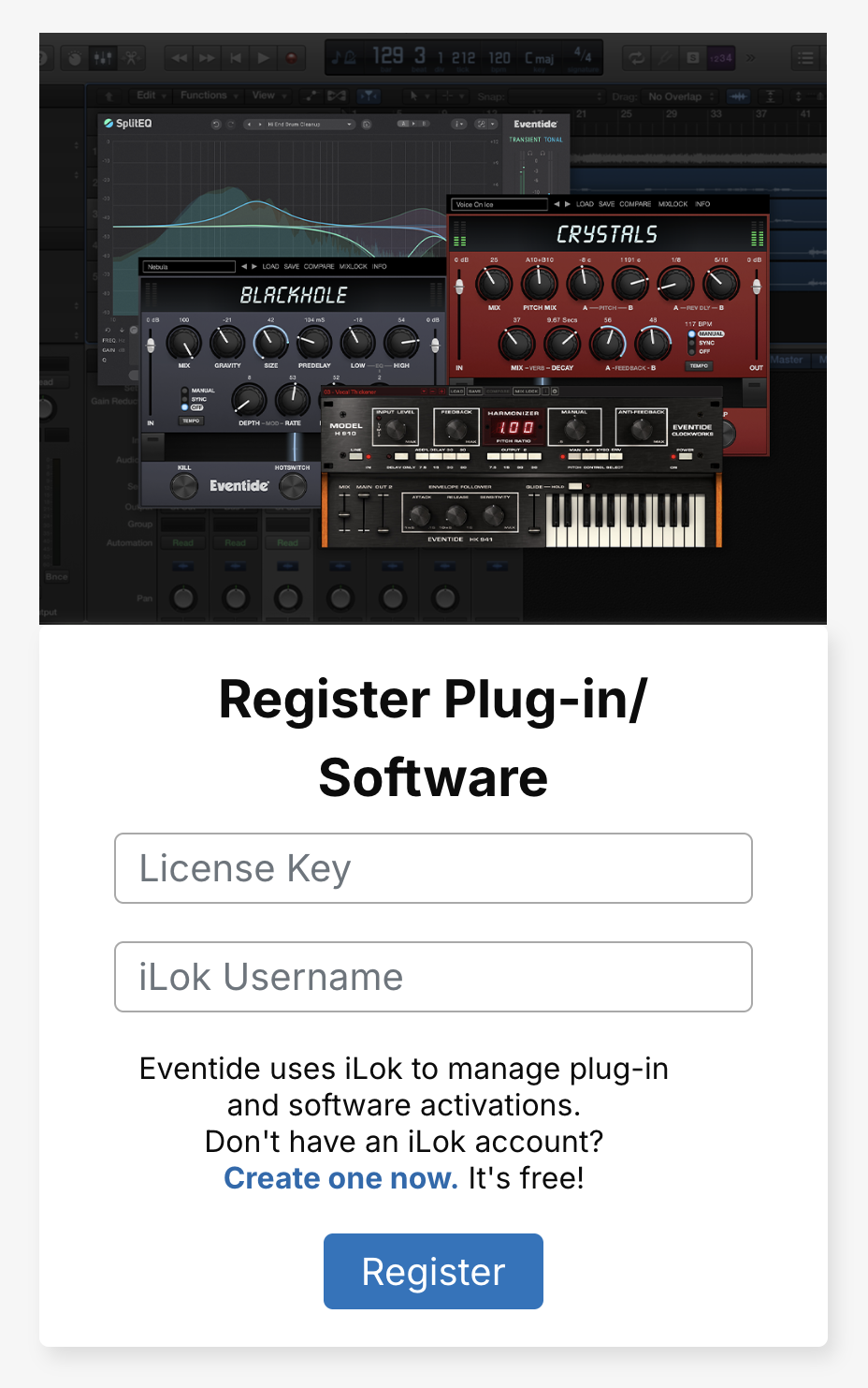 Eventideプラグインのアクティベート状況はiLok License Manager(ライセンスマネージャー)で管理されるため、Eventideプラグインの製品登録、アクティベートを行う前に、iLokアカウントを設定する必要があります。