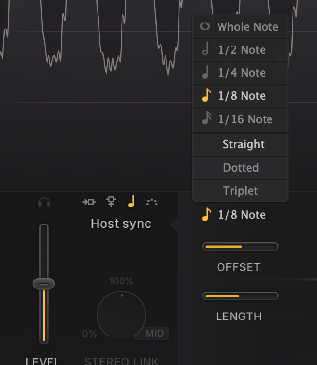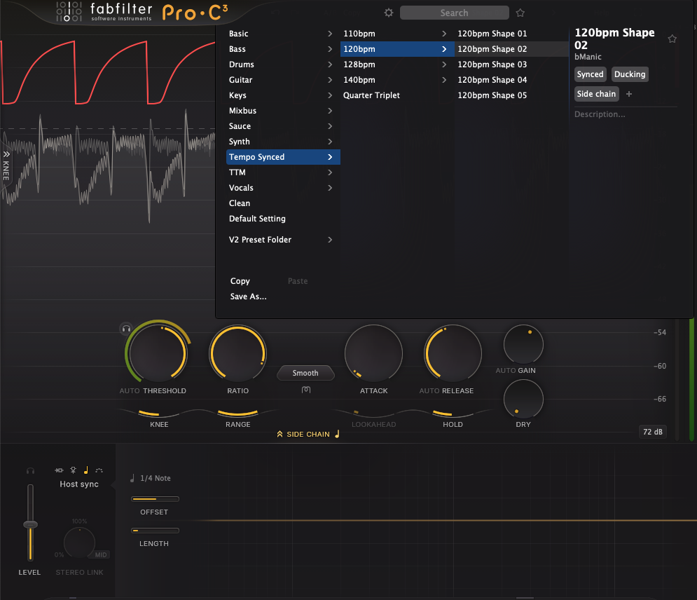 DAWで設定したテンポに合わせてサイドチェーンが発動する感じですね。モード選択をホストシンクに切り替えるだけでDAWで設定したテンポにシンク完了です。