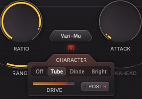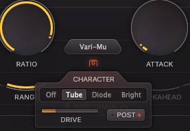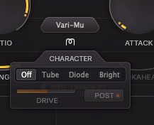 キャラクターは、Tube、Diode、Brightを選択することができ、TubeとDiodeがあるのでコンプレッションスタイルとも混乱しそうな感じがしますね。キャラクターの場合、アナログサチュレーション、サウンドのカラー、ルーティングの選択(プリ/ポスト)やドライブによって音色を作れるようです。