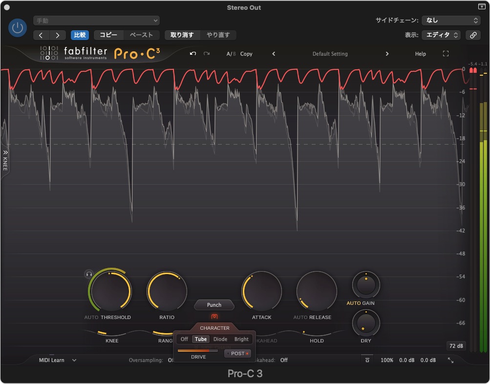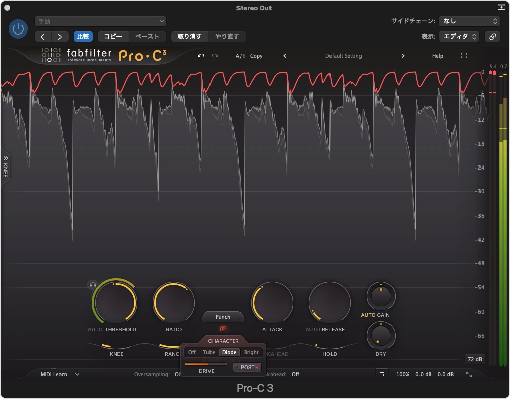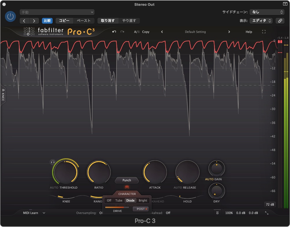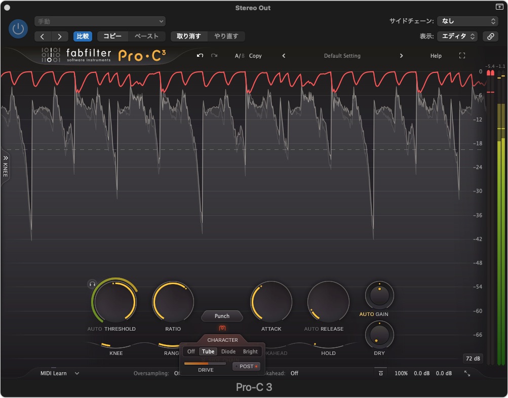 オレ個人の使い方のイメージでは、コンプのかかり方をコンプレッションスタイルで選んで、コンプをかけ、そのサウンドの味付けをキャラクターで調整するというイメージで使うと失敗は少ないのかな?と思いました。