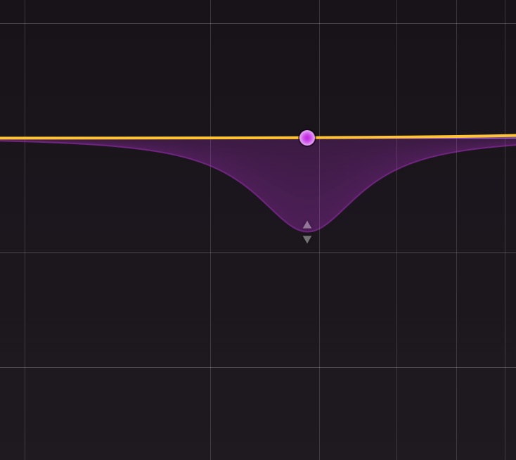 使い方としては、ギターの低域部分がボーカルの邪魔をしないようにしたいのでボーカルトラックと当たる帯域のみを抑えることにします。なだらかなカーブではなく、少し急なカーブにしたいのでスロープを急に変更しましょう。