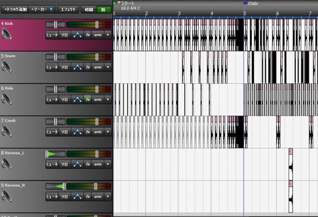 現在、制作を行っている楽曲のドラム・パートも、キック、スネア、ライド・シンバル、クラッシュ・シンバルとパーツ毎にトラックを分けています。