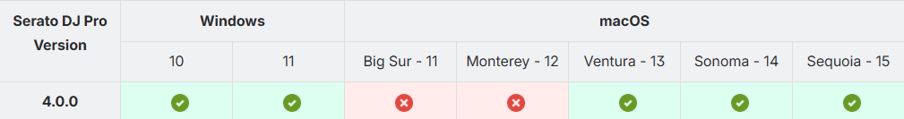 Serato DJ Pro | OS互換表(v.4.0以降)