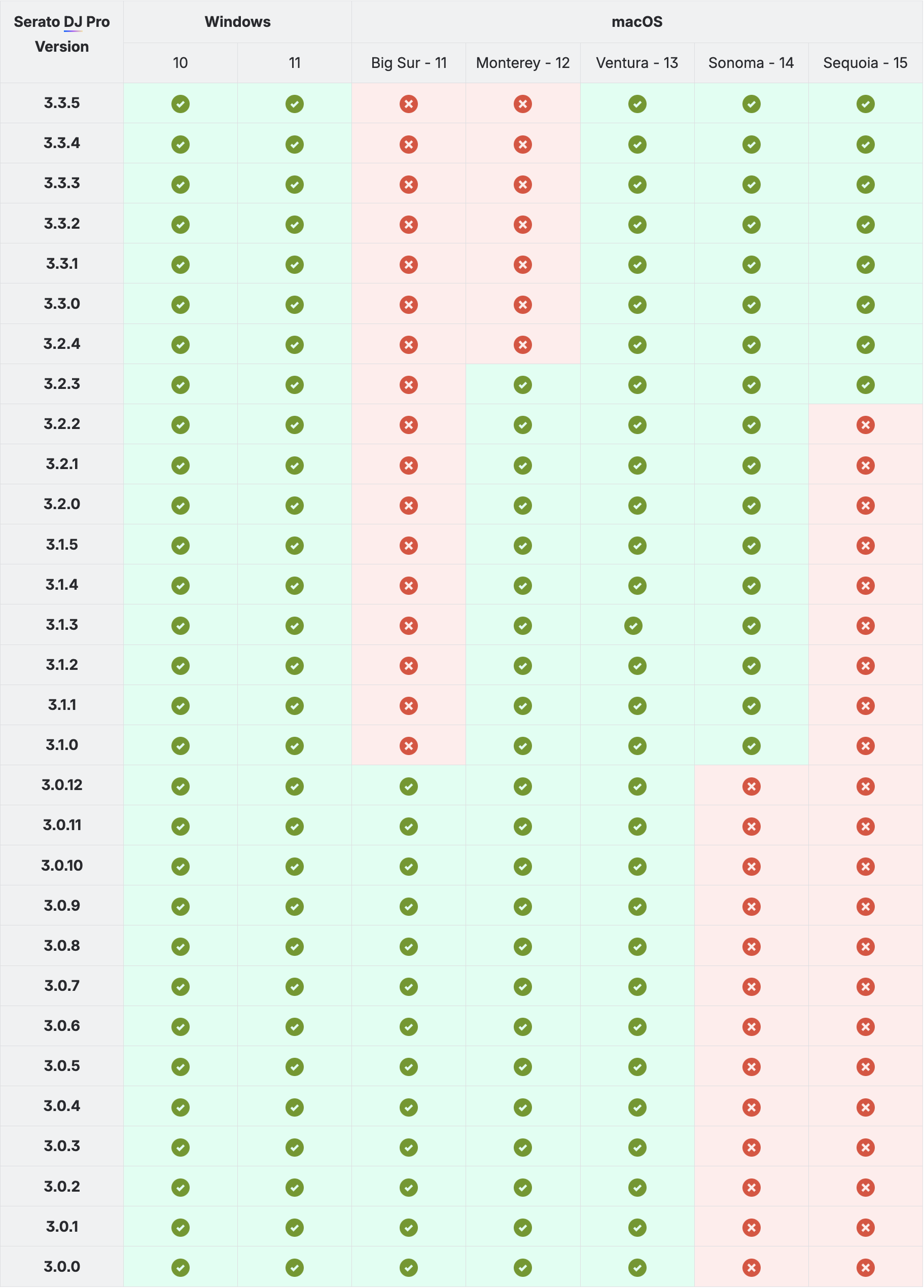 Serato DJ Pro | OS互換表(v.3.0以降)