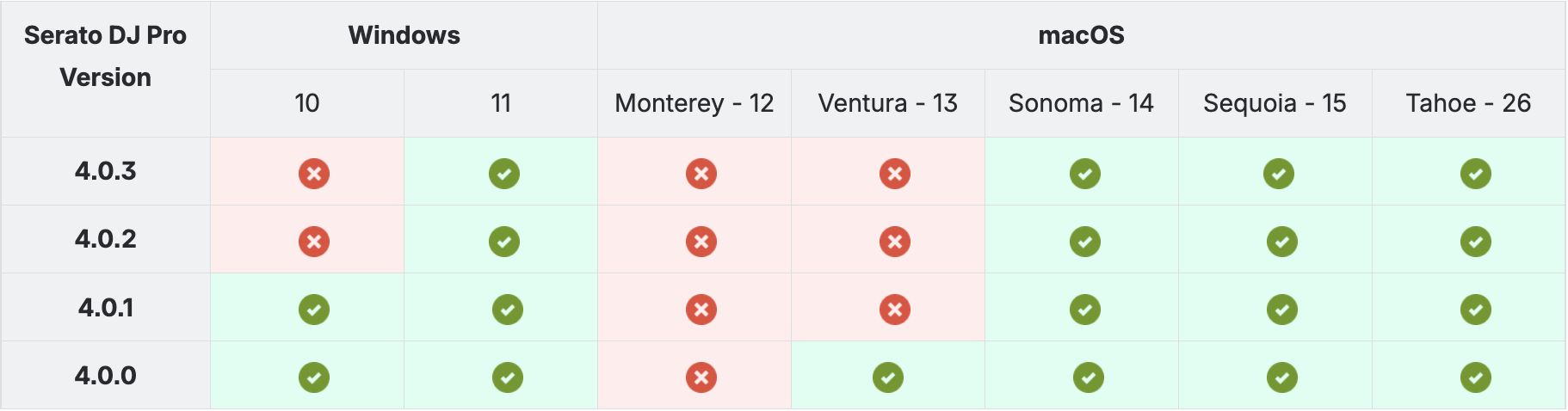 Serato DJ Pro | OS互換表(v.4.0以降)