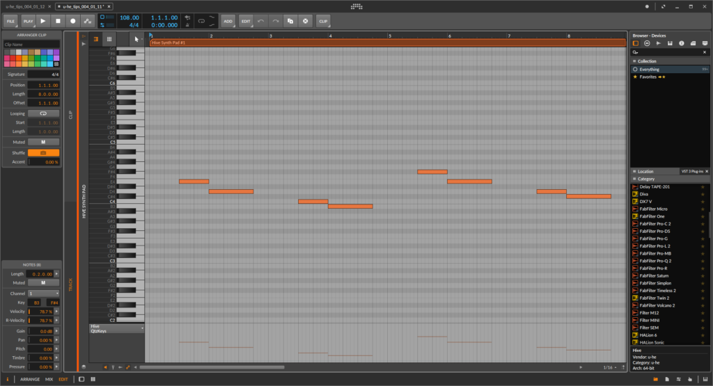 この音色でデモサウンド(音源:u-he_demo_004_04)のようなモチーフを作成しました。この音色によるフレーズは図のような感じに打ち込んでいます。