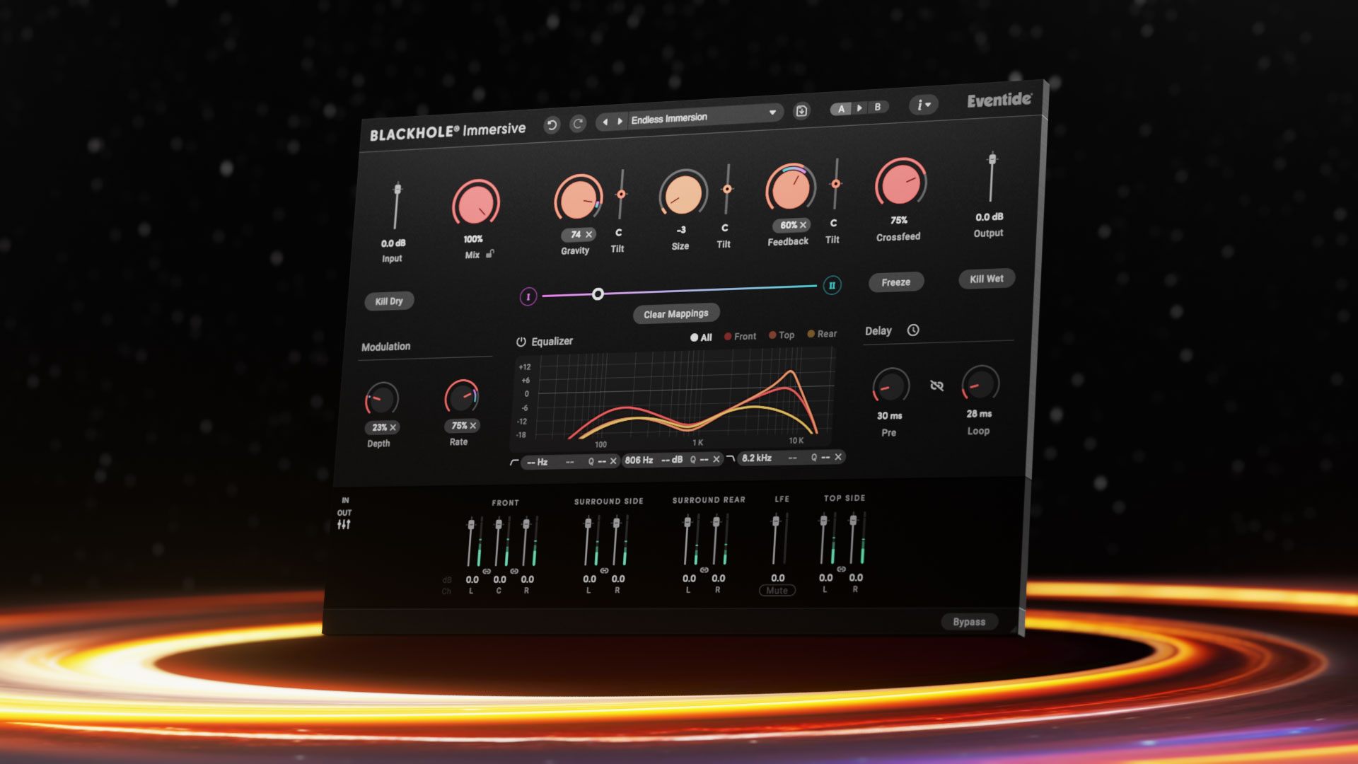 Blackhole Immersive は、イマーシブ・オーディオ、Dolby Atmos®、そしてサラウンド・プロダクションのワークフローに完全に最適化すべくゼロから設計されたリバーブです。ステレオ版のBlackholeで絶大な支持を集めるEventideのシグネチャー・サウンドを、あなたのイマーシブ・ミックス全体へと劇的に拡張させます。