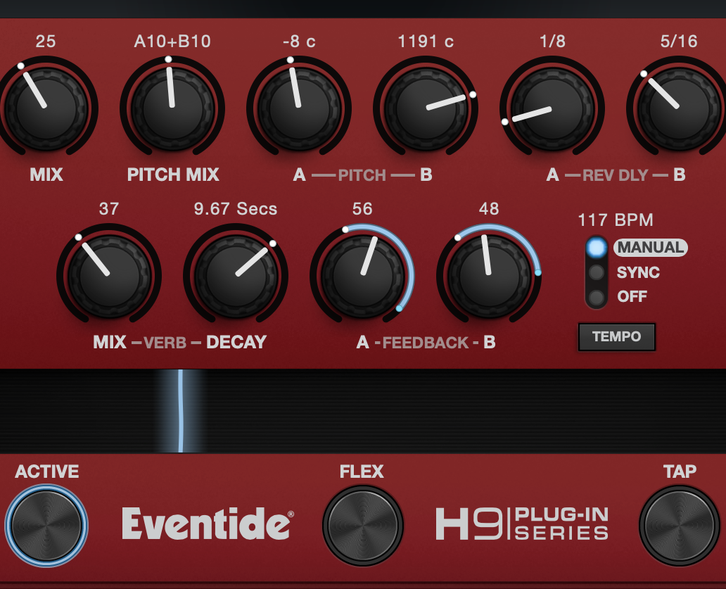 - 2ボイス仕様のピッチシフターを搭載し、各ボイスは2オクターブ下〜2オクターブ上まで設定可能