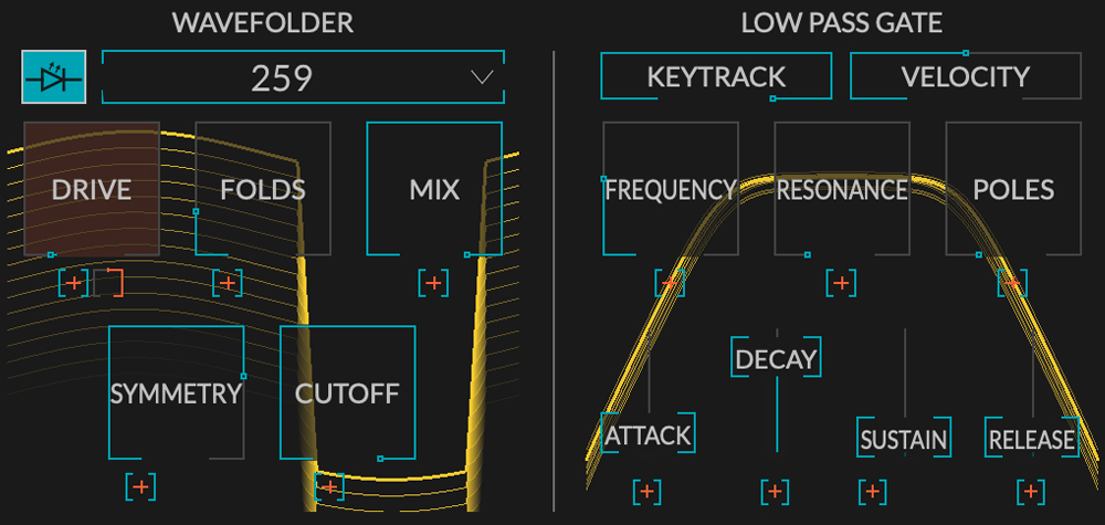 Generateのカオスジェネレーターは、Buchla 259、Buchla 259のModel Bentバージョン、Saturate(人気のマスタリングプラグインから)、または斬新なAnimatedやFractalウェーブフォルダーの5つのウェーブフォルダーから選択してルーティングされ、それぞれが独自の倍音を追加します。その後、Don Buchlaのアイデアにインスパイアされたローパスゲートへと続きます。これらのモジュールを組み合わせることで、独自の風味を持つ多用途で音楽的なボイスが作成されます。