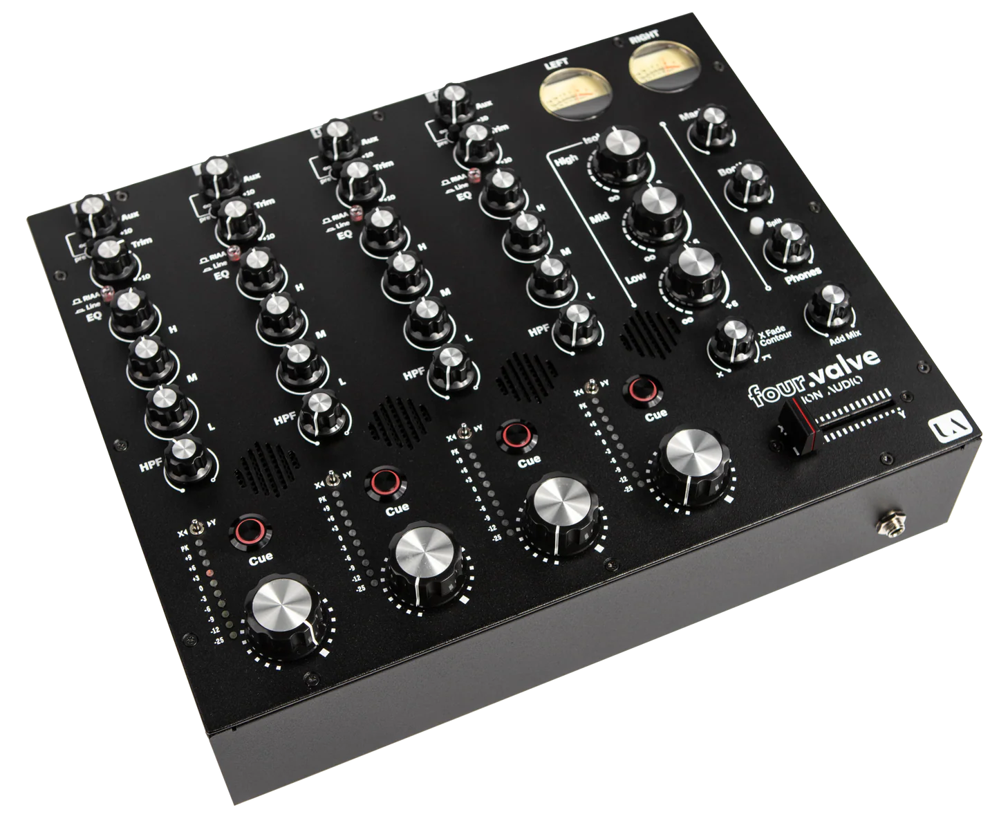 four.valve rotary Mixerは、真空管が持つ普遍的な魅力と現代の精密なエンジニアリングを融合させ、プレミアムなDJ体験を実現するために構築されました。4つの各チャンネルには高品質なフォノおよびライン入力が装備されており、多様なオーディオソース間でのシームレスなトランジションを可能にします。滑らかなロータリーフェーダー、Innofaderクロスフェーダー、正確なEQコントロールを備えた直感的なレイアウトにより、DJはダイナミックで魅力的なミックスを直感的に作り出すことができます。